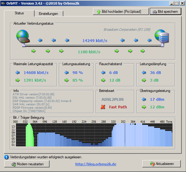 Inzwischen wurde der selbe Anschluss ein weiteres Mal geändert. Es läuft jetzt DSL 16000, bzw. DPBO-bedingt "DSL14000", da die bandbreitenstarken Frequenzen am Outdoor wie schon gesagt nicht so recht nutzbar sind. DIe Sache sieht jetzt so aus: